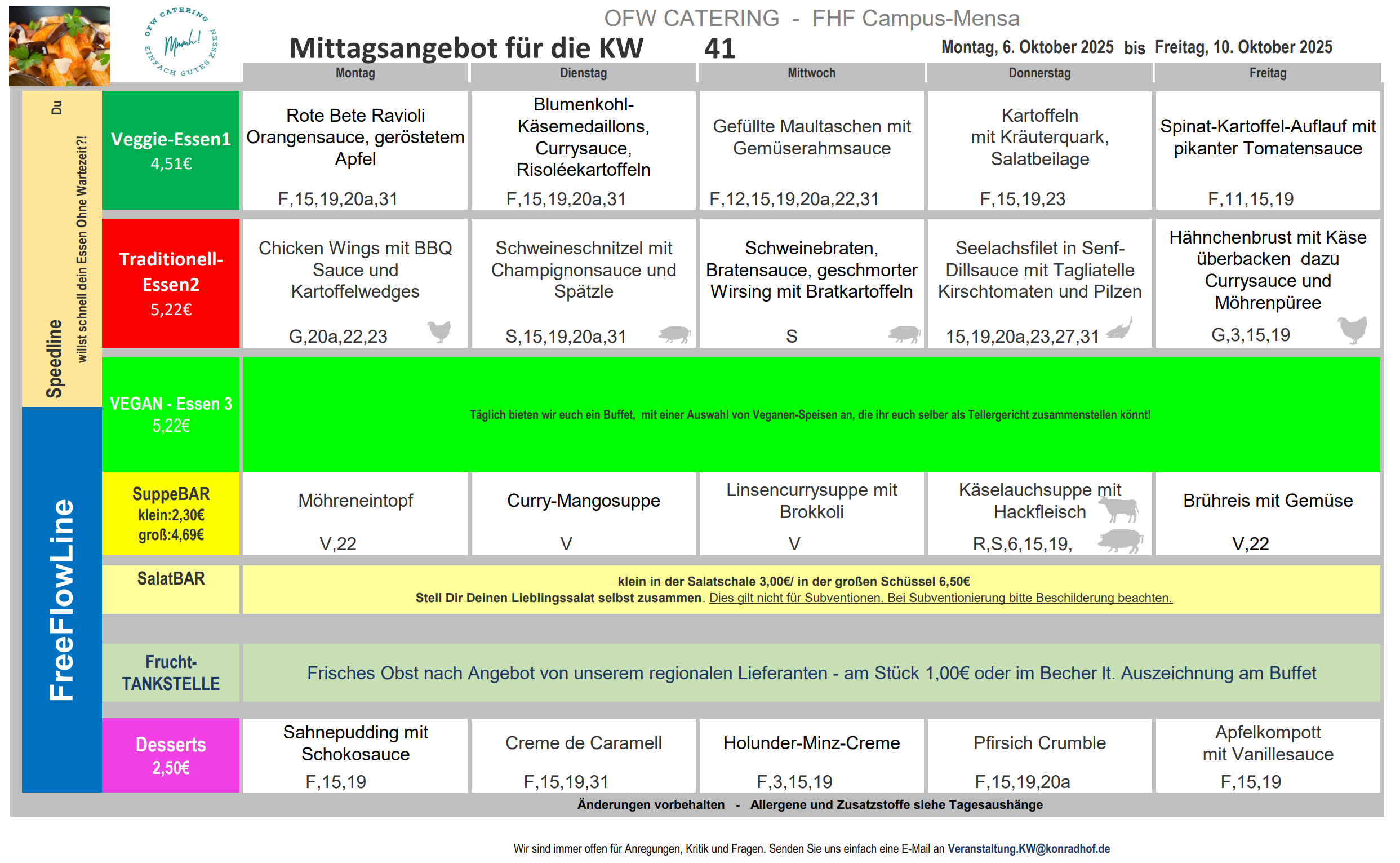 Sollten Sie eine Lebensmittelintoleranz/-Allergie haben, melden Sie sich bitte vor Anreise in der Mensa (Tel.: 03375 672-155), damit wir Ihnen dennoch eine ausgewogene Mahlzeit zur Verfügung stellen können.